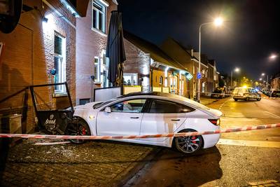 Tesla botst op auto en ramt daarna terras van café Bet Kolen in Tilburg, schade aan scheidingswand