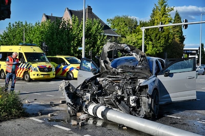 TILBURG - Een auto is zondagmiddag vlak na 18.00 uur tegen een verkeerspaal gecrasht op de Ringbaan-Noord in Tilburg. Na de klap vloog het voertuig in brand. Twee inzittenden raakten gewond.
