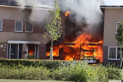 UDEN - In meerdere woningen aan de Noorderhof in Uden woedt donderdagmiddag brand. Het vuur zou zijn ontstaan toen een van de bewoners aan zijn elektrische scooter aan het werken was. Het vuur sloeg daarop snel over naar de overkapping en naburige woning.