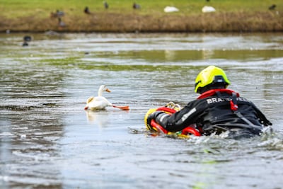 Een eend op het ijs aan Het Ruim op Urk zorgde voor een onverwacht brandweer-en-eendspel. Het dier zat vast in een spagaat en leek geen kant op te kunnen, totdat de brandweer met een duiker ter plaatse kwam.