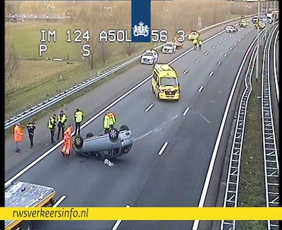 Een auto is maandagochtend rond 10.45 uur over de kop geslagen op snelweg A50. Het ongeluk gebeurde iets voor knooppunt Valburg.