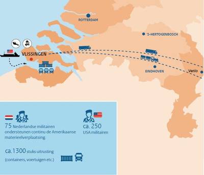 75 Nederlandse militairen ondersteunen van begin januari tot begin februari 250 Amerikaanse militairen bij een groot militair transport. Maar liefst 1300 stuks materieel waaronder legervoertuigen en containers gaat vanuit Vlissingen via Noord-Brabant per spoor en de weg naar Polen en Litouwen.