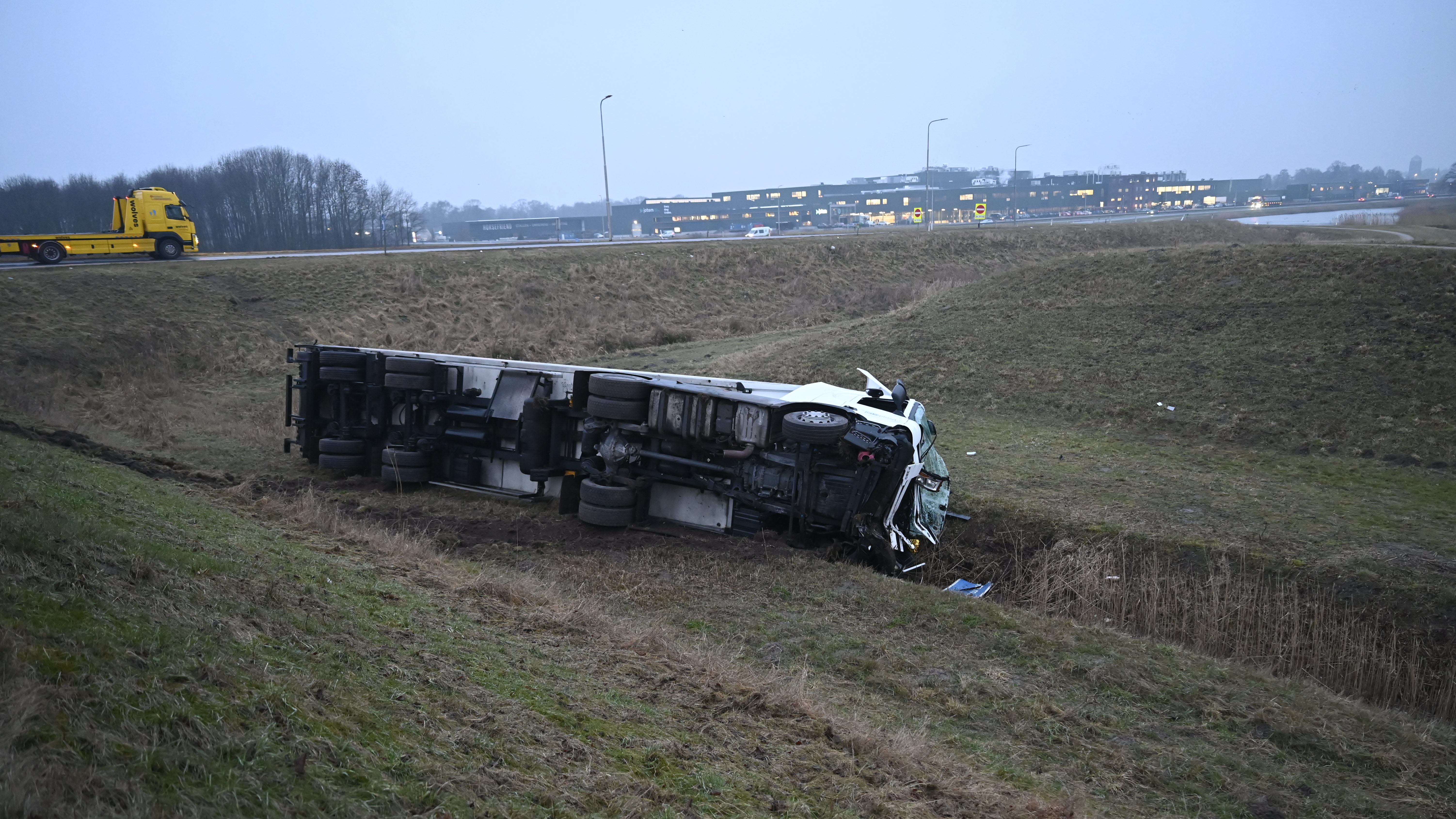 woensdag 4 februari 2026, 08:02 uurEen vrachtwagen is vanmorgen op de N36 bij Vriezenveen van de weg geraakt en meters lager op zijn kant in een talud terechtgekomen. Vlak daarvoor kwam de vrachtwagen in botsing met een auto. De vrachtwagenchauffeur raakte daarbij gewond.