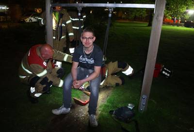 VUGHT - De brandweer ging zondagavond af op een melding van een vastzittend kind in een schommel aan de Lopeshoeve in Vught. Daar aangekomen bleek het te gaan om 17-jarige Damian Oskam. Het was gezellig, hij had veel gelachen maar ook ‘pijn tussen de benen’, vertelde de tiener na zijn bevrijding.