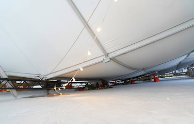 Het dak van de tent van de ijsbaan bij de IJzeren Man in Vught is zaterdagmiddag ingestort. Door hevige sneeuwval. „Gelukkig zagen we het tijdig aankomen”, zegt Karin van de Ven van het IJM’s Winterparadijs.