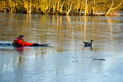 Tot je oksels in het vrieswater voor een eendje, deze held doet het gewoon