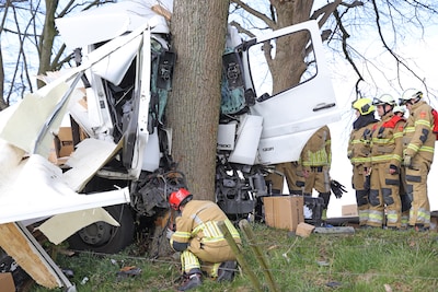Truckchauffeur bekneld en zwaargewond bij botsing tegen boom, cabine om stam heen gekruld