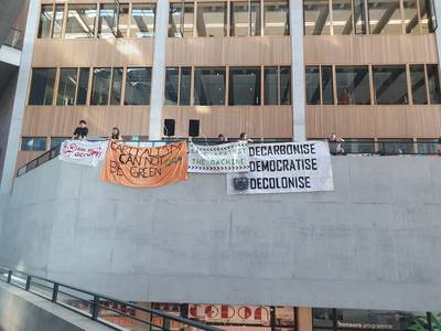 dinsdag 27 juni 2023, 11:10 uurKlimaatactivisten van de actiegroep End Fossil hebben dinsdagochtend een deel van het Forumgebouw op de Wageningen Campus bezet. Ze hebben spandoeken opgehangen. Het is nog onduidelijk hoelang de actie gaat duren.