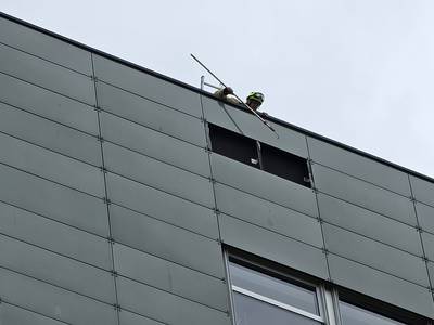 WAGENINGEN - Woensdagmiddag 28 juni omstreeks 13.50 uur werd de hulp van de brandweer ingeroepen om een glasplaat te verwijderen van het Orion-gebouw aan de Bronland in Wageningen.