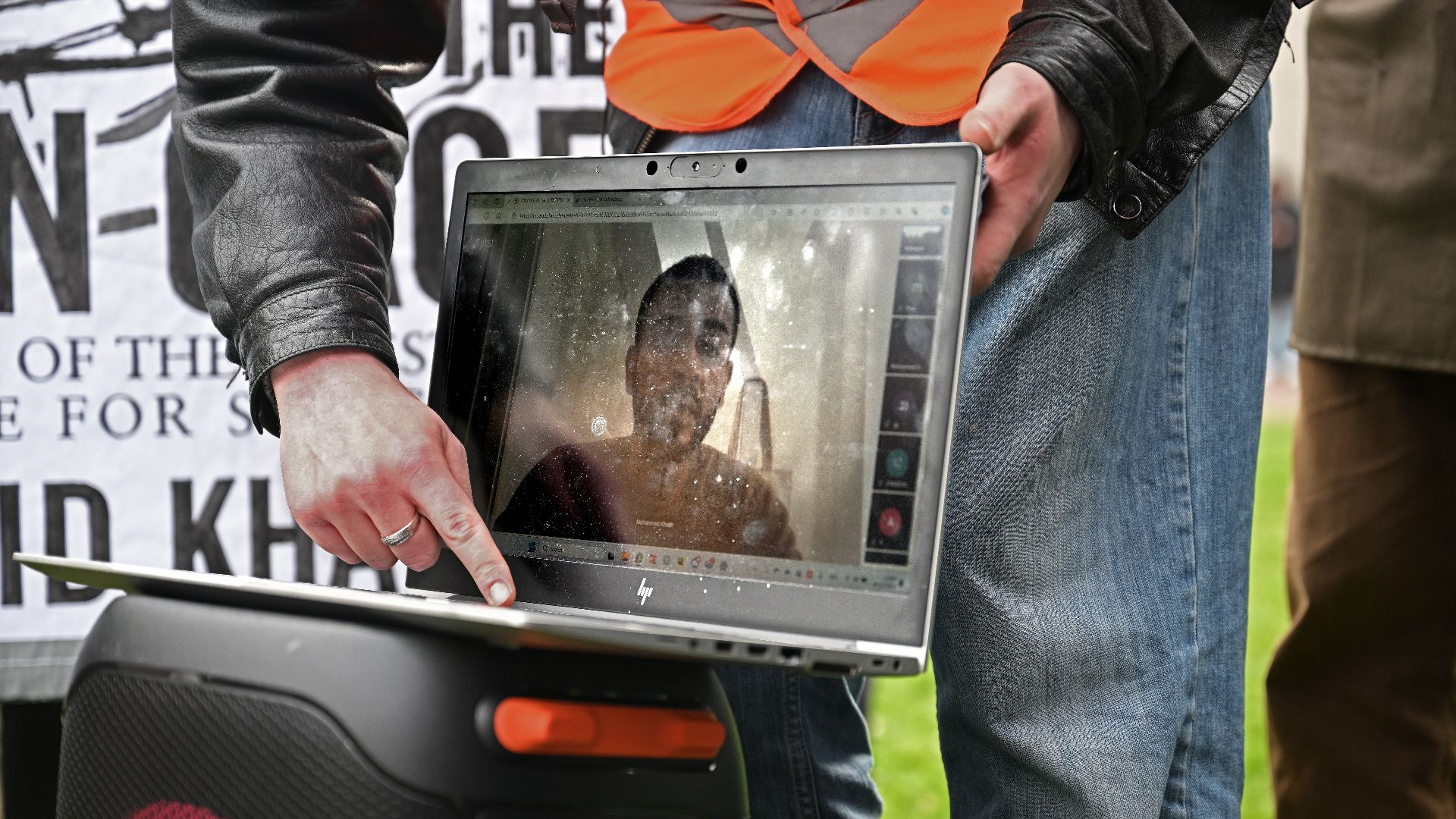 Activist Mohammed Khatib van de omstreden pro-Palestijnse organisatie Samidoun spreekt vrijdag via een videoverbinding bij een protest in Wageningen. Dat laat een woordvoerder van de pro-Palestijnse actiegroep Wageningen Encampment weten.