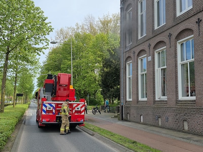 Brand in kamer van woonzorgcentrum, zwarte rook zichtbaar uit bovenverdieping