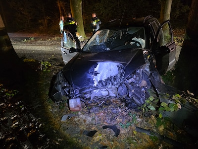 Een auto is in de vroege uren van de woensdagochtend tegen een boom gecrasht langs de Geertjesweg in Wageningen. De auto kwam volledig in de kreukels te liggen door de klap.