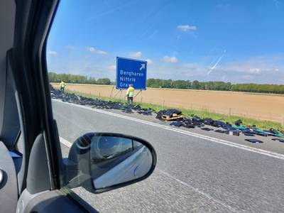 Vrachtwagen gekanteld bij Wijchen, snelweg bezaaid met troep