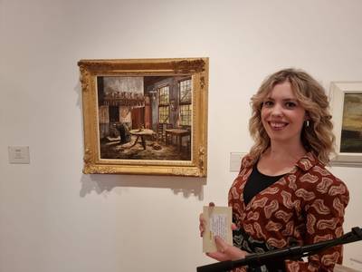 WINTERSWIJK - Het vroege werk Boereninterieur met haard in de Achterhoek van kunstschilder Piet Mondriaan is thuis in Winterswijk. Woensdagochtend onthulde Villa Mondriaan-directeur Jana Roovers (25) het schilderij in het Winterswijkse museum.