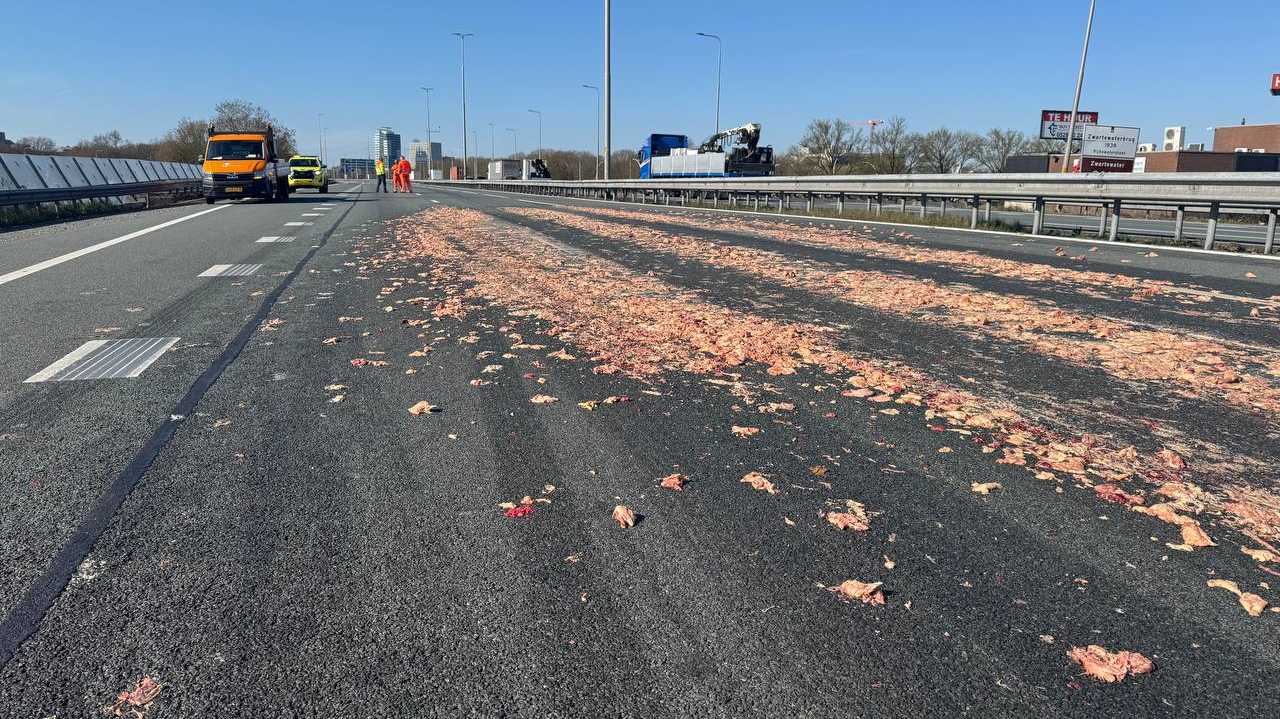 De snelweg A28 bij Zwolle is woensdag urenlang in noordelijke richting helemaal afgesloten vanwege slachtafval dat over de volledige breedte van de rijbaan ligt. Het schoonmaken van de weg is begonnen, al is dat geen makkelijke klus.