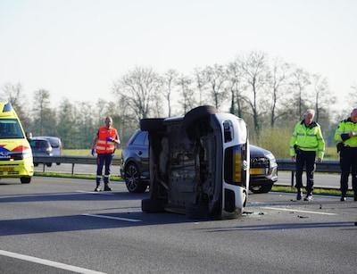 Auto belandt op zijkant door ongeluk op A28 en veroorzaakt file, waarin nog meer auto’s botsen